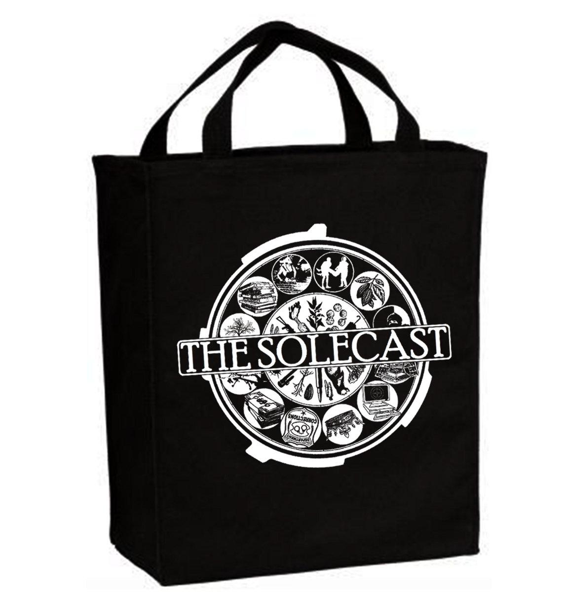 A big ass bag to put groceries, books or other shit in. This tote is bigger than the standard size and the bag design was chosen for its utility. All orders come with Solecast stickers.